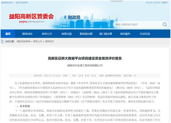 日前,益阳高新区财政局委托第三方机构对高新区征地拆迁安置大数据平台项目开展了建设资金绩效评价,结果为“优”等级,这是对智图科技技术与服务的双重肯定。